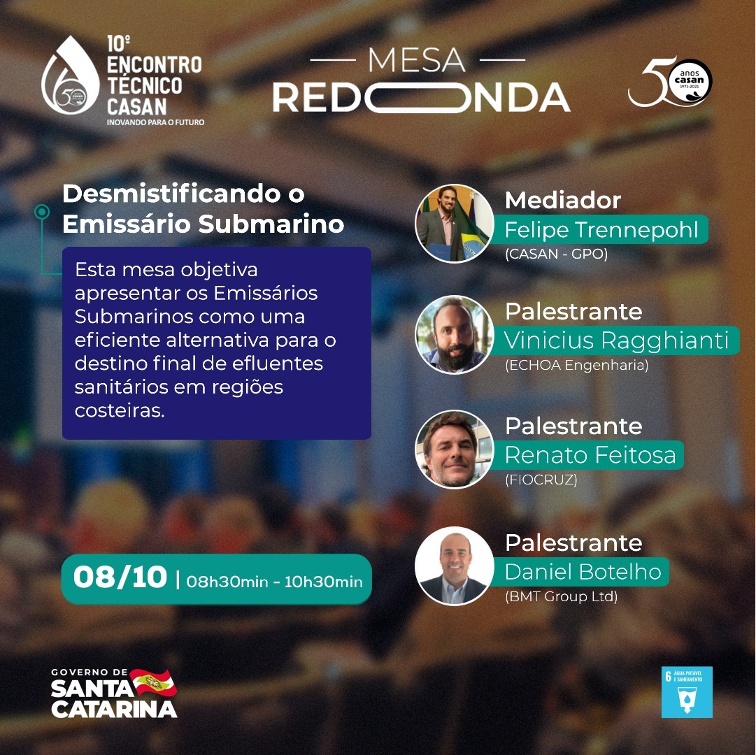 Com o título “Desmistificando o Emissário Submarino”, a mesa-redonda será realizada no dia 8 de outubro, entre 8h30min às 10h30min. Inscrições podem ser feitas no link: https://10encontrotecnico.casan.com.br. O evento ocorre de forma online, entre 4 e 8 de outubro.