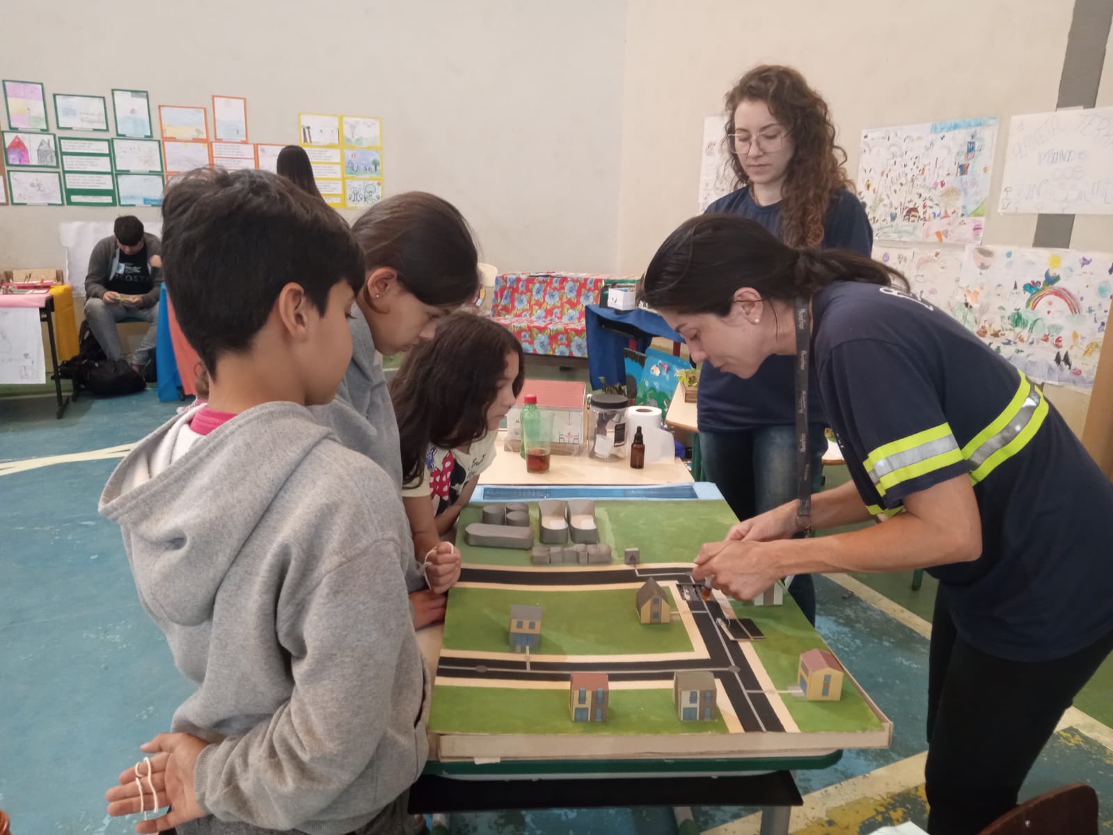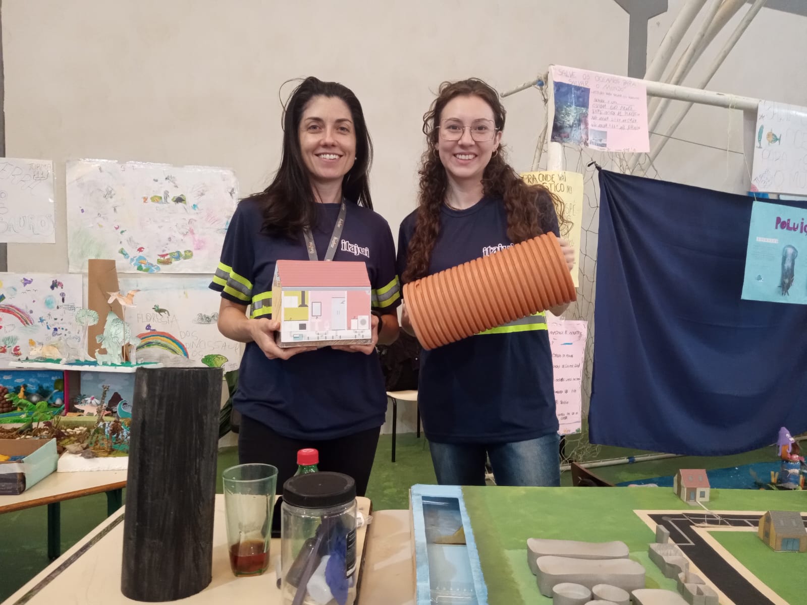 Com a maquete, as educadoras socioambientais mostraram como o esgoto coletado nas residências é conduzido por uma rede de tubulações até às Estações de Tratamento de Esgoto para depuração. Na apresentação são utilizados iodo e água sanitária para representar a poluição e a descontaminação da água.
