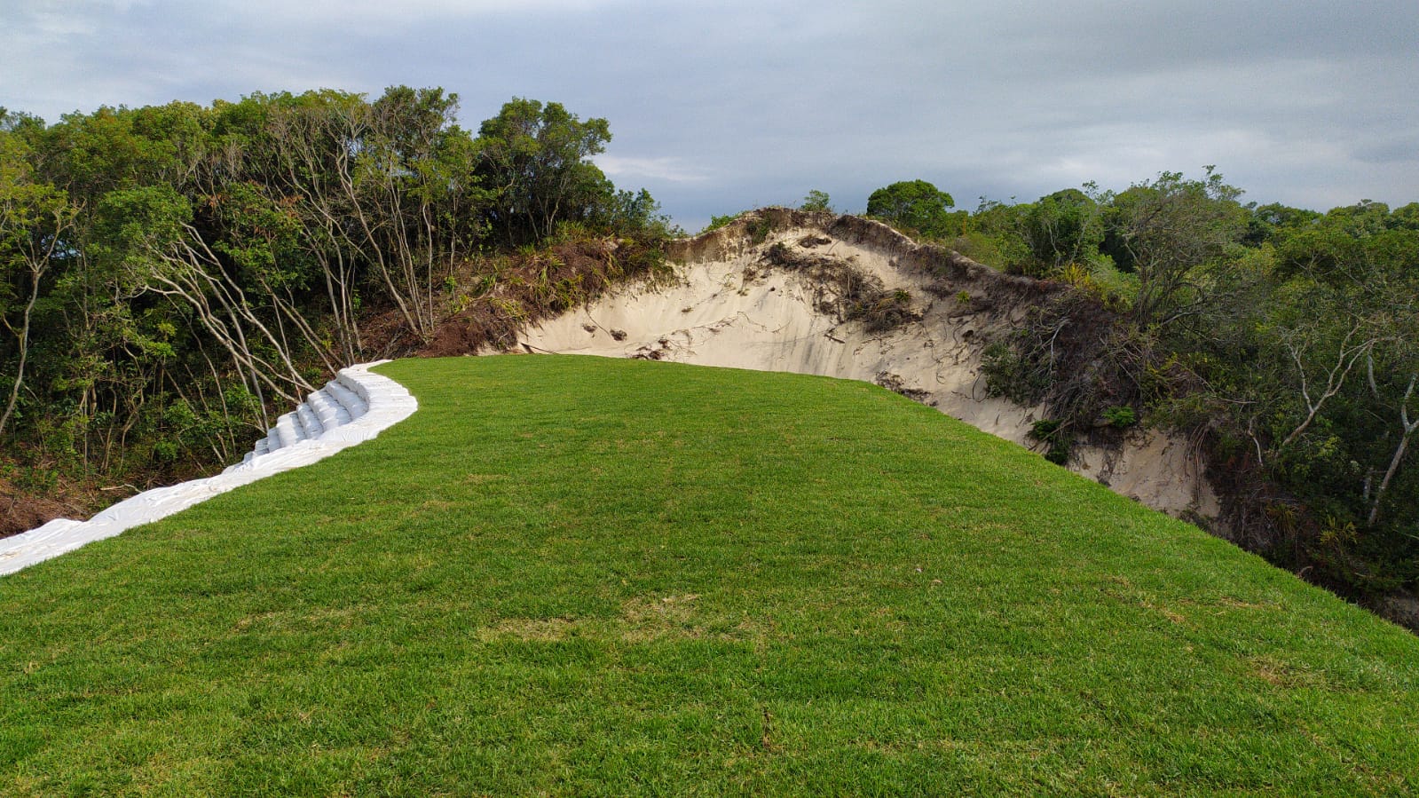 Seguindo o Plano de Recuperação Ambiental da Lagoa da Conceição, estão na fase final as obras do talude de contenção no local onde as dunas deslizaram durante as chuvas de janeiro de 2021.
