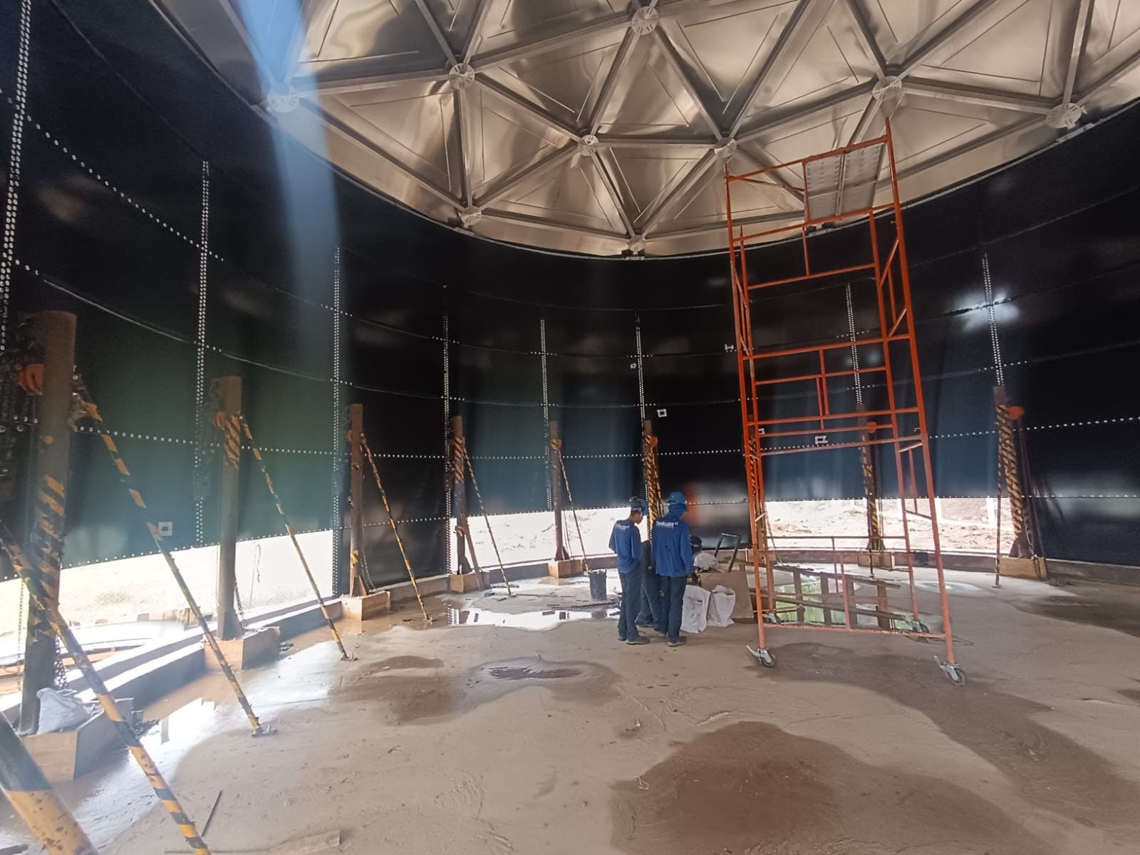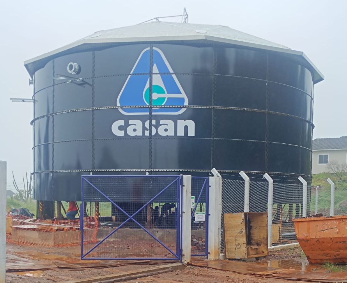 O reservatório está em fase de montagem da placas de aço vitrificado, uma tecnologia que garante mais segurança, agiliza a construção do reservatório e reduz a necessidade de manutenções.