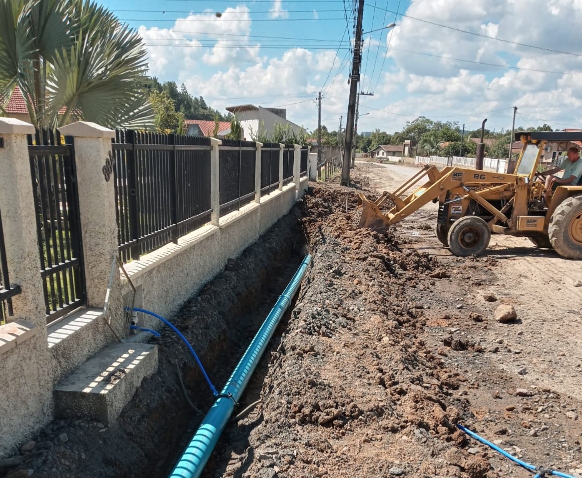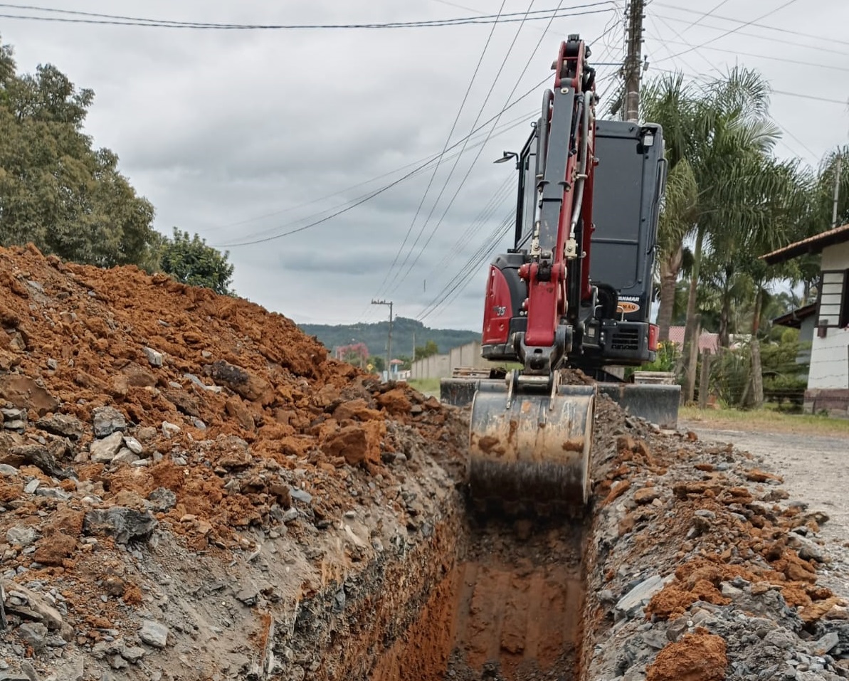 No trabalho em colaboração com o poder público municipal a Prefeitura de Agrolândia disponibilizou uma miniescavadeira para a abertura das valas que recebem as tubulações e para o auxílio da CASAN em diversos outros serviços.