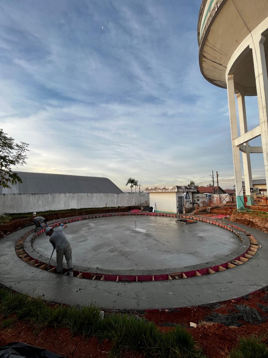 As obras do reservatório do Bairro Jardim Elizabete foram retomadas em maio e seguem com a concretagem da base do tanque. Assim como o reservatório de Lombas, a unidade do Jardim Elizabete também será feita de aço vitrificado, um material mais resistente às intempéries climáticas e que possui 65 anos de garantia.