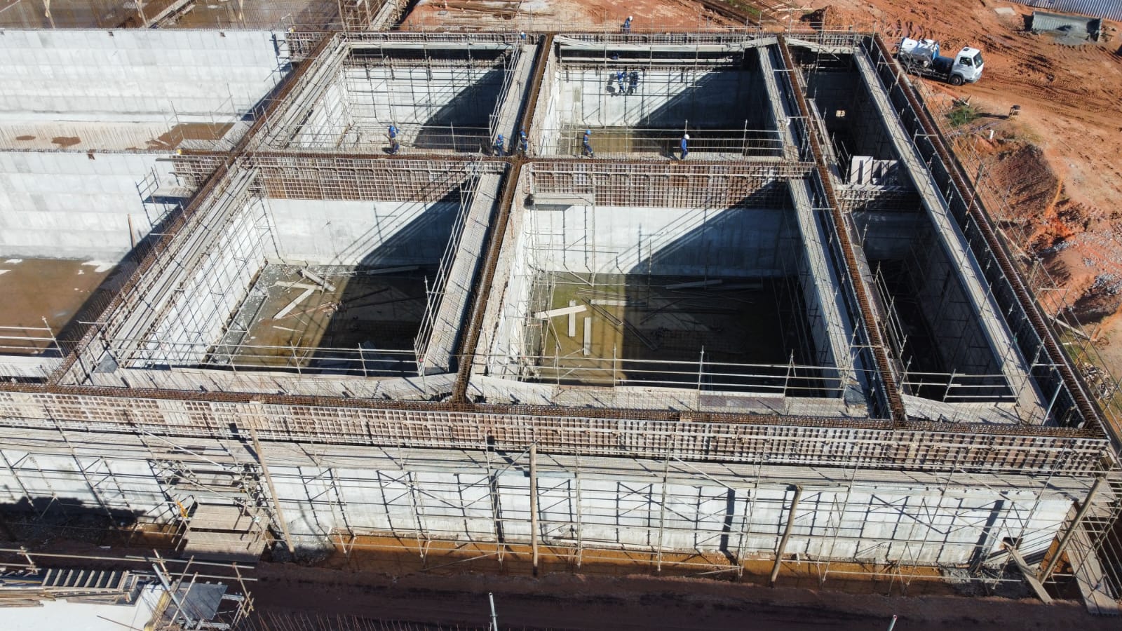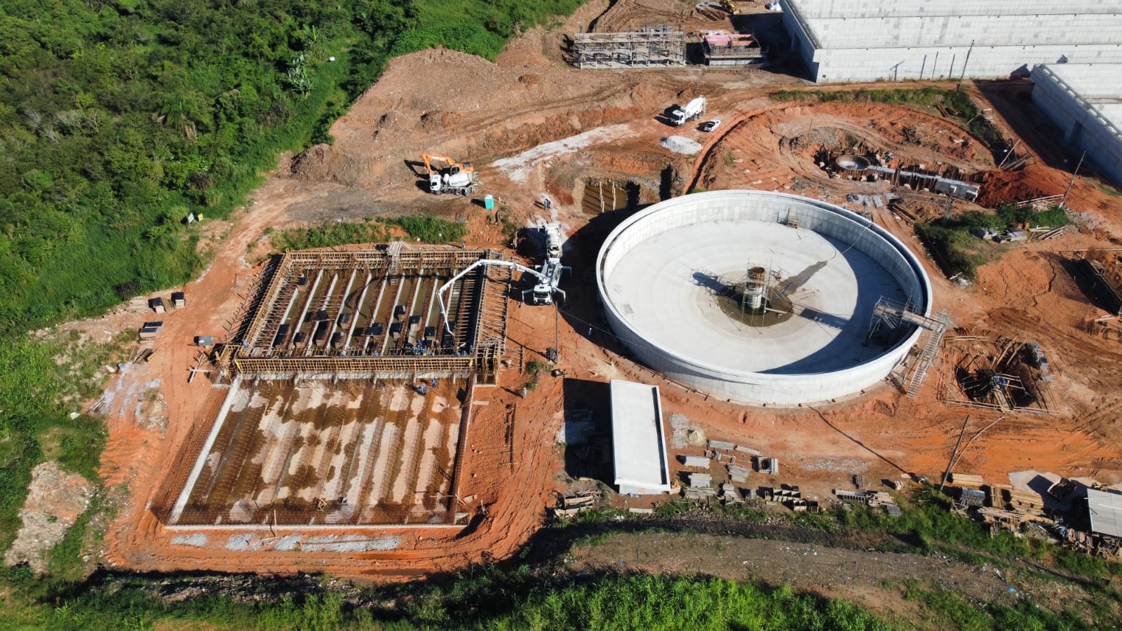 Uma das operações foi a concretagem da parede do tanque de contato, que envolveu 12 caminhões betoneiras para depositar 100 metros cúbicos de concreto na estrutura. Neste local vai ocorrer a adição de cloro para desinfecção do efluente e eliminação de microorganismos remanescente do tratamento.