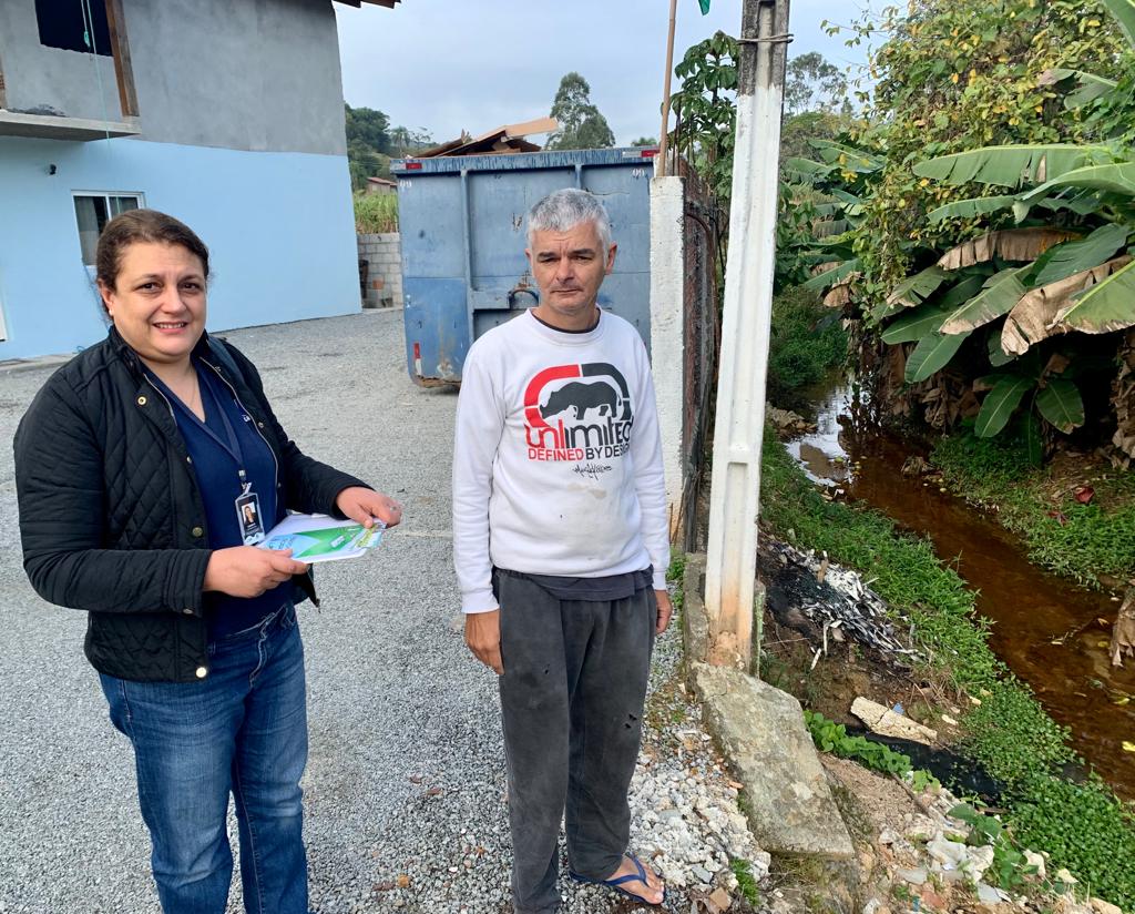 Moradores recebem a visita do projeto Socioambiental da CASAN, esclarecendo dúvidas e mostrando otimismo para aguardar a infraestrutura de esgoto que atenderá sua região.