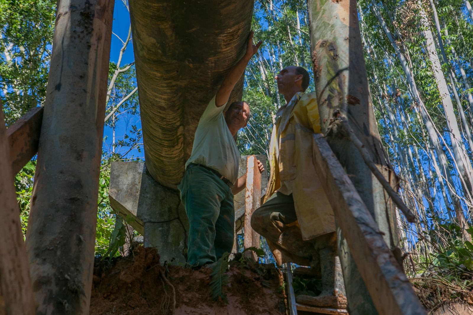 O solo na região da captação do Rio Pilões (no município de Santo Amaro) está muito encharcado e instável devido às chuvas, dificultando a fixação dos pilares que sustentam a adutora. Por medida de segurança do Sistema, a CASAN resolveu colocar estaqueamentos metálicos junto à estrutura de madeira, mas a Empresa esclarece que não houve novo desmoronamento, como divulgado em redes sociais.