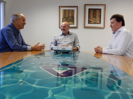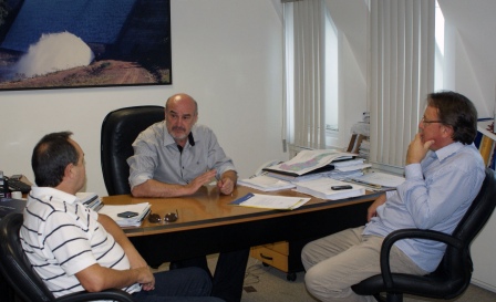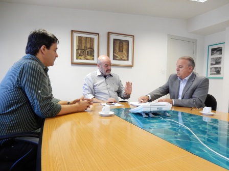 Prefeito de Sombrio, Zênio Cardoso, Presidente da CASAN, Valter Gallina, e o Prefeito de Turvo, Ronaldo Carlessi em reunião na sala da presidência / 07 de abril de 2015