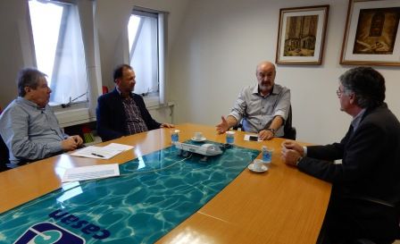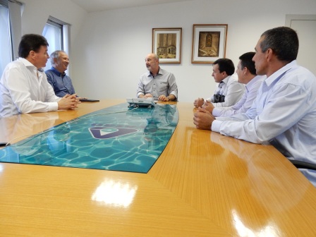 Prefeito de Turvo, Ronaldo Carlessi, Prefeito de Sombrio, Zênio Cardoso, Presidente da CASAN, Valter Gallina, Prefeito de São João do Sul, João Rubens dos Santos e vereadores em reunião na sala da presidência / 07 de abril de 2015