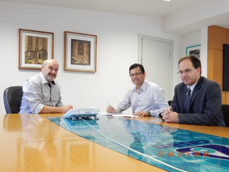 Diretor Comercial da CASAN, Antônio Varella do Nascimento, Vice-prefeito de Gravatal, Alvaro José Medeiros Júnior, Presidente da CASAN, Valter Gallina, Prefeito de Gravatal, Jorge Leonardo Nesi, em reunião na sala da presidência / 07 de abril de 2015