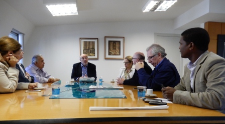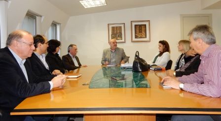 Presidente da CASAN, Valter Gallina, Secretária de Estado da Justiça e Cidadania, Ada de Luca, Secretário Acélio Casagrande (Articulação Nacional), Diretor de Operação e Meio Ambiente da CASAN, Paulo Roberto Meller, e comitiva de vereadores do Sul do Estado em reunião na sala da presidência / 15 de junho de 2015