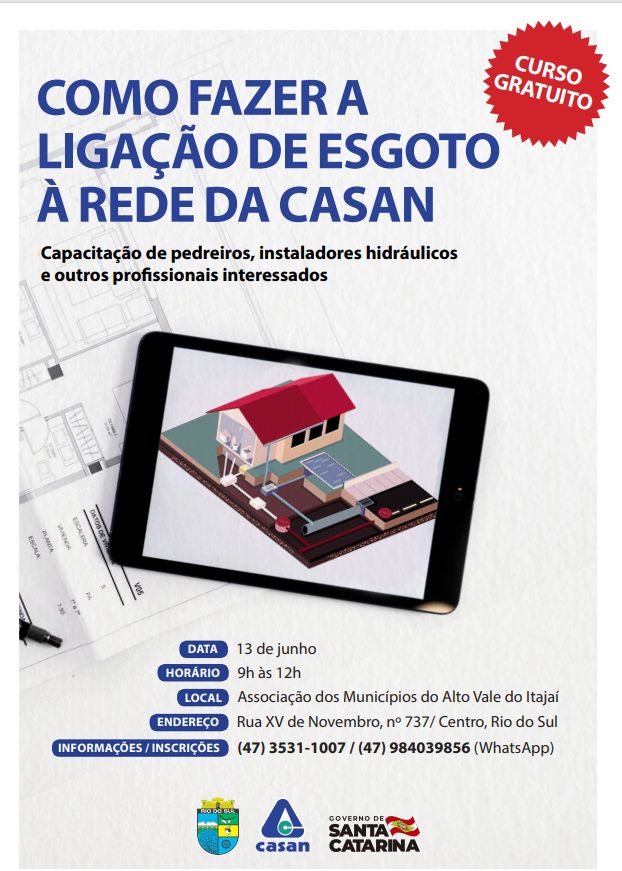 A CASAN está com inscrições abertas para curso gratuito sobre a ligação à rede de esgotos na cidade de Rio do Sul. A capacitação é voltada para encanadores, pedreiros, instaladores hidráulicos e outros profissionais interessados. Informações e inscrições pelo telefone (47) 3531-1007 ou (47) 984039856 (WhatsApp).