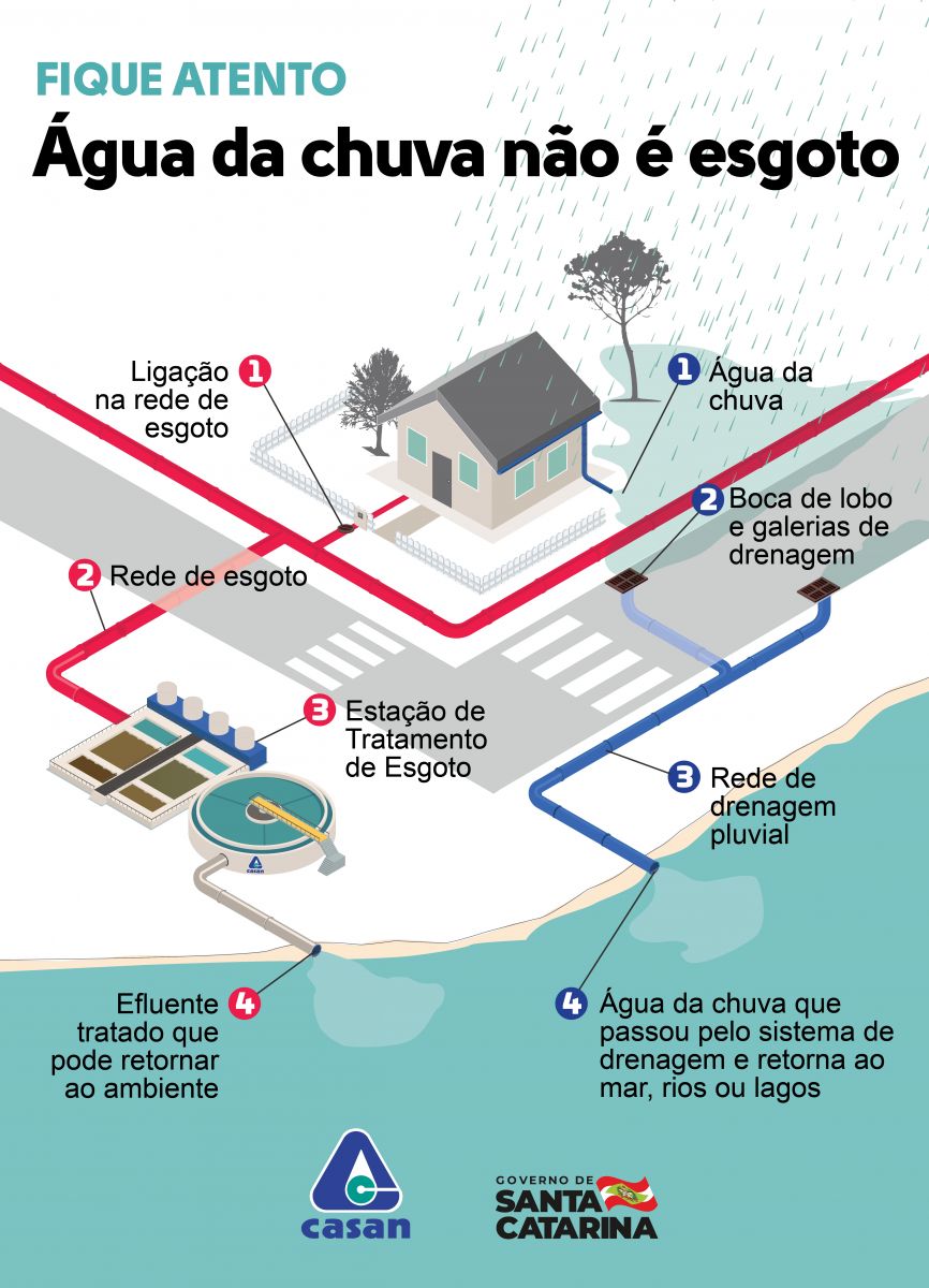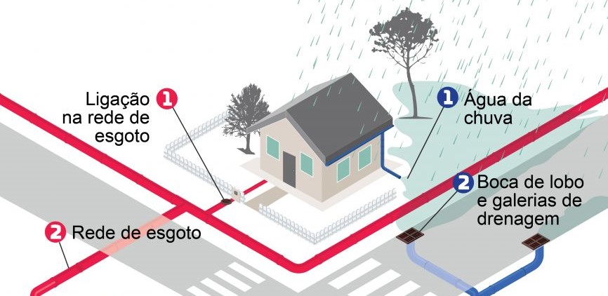 Uma das questões que requer muita atenção é a separação entre água da chuva e esgoto. A água da chuva não pode ir para a rede de esgoto, pois sobrecarrega o sistema, criando o risco de causar transbordamentos. Além disso, a grande vazão d'água prejudica o tratamento realizado na ETE (Estação de Tratamento de Esgoto). A sobrecarga na rede coletora de esgoto também pode provocar o retorno do esgoto para as residências.