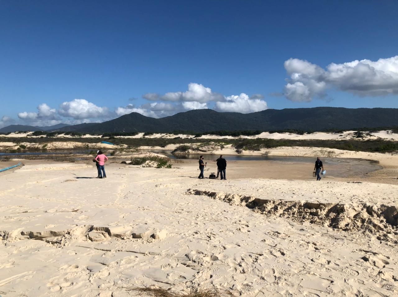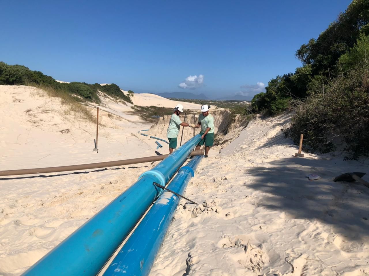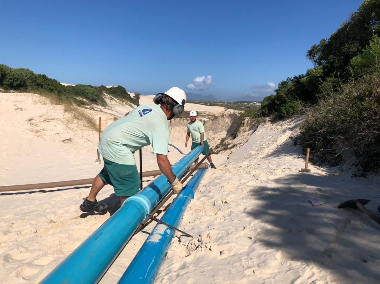 Para aproveitar o tempo firme da segunda-feira, a Companhia estendeu mais 250 metros de tubulação, aproximando a ponta final do sistema de bombeamento a uma área de restinga, preservando ainda mais as dunas cujo trajeto foi momentaneamente alterado pela força das águas.