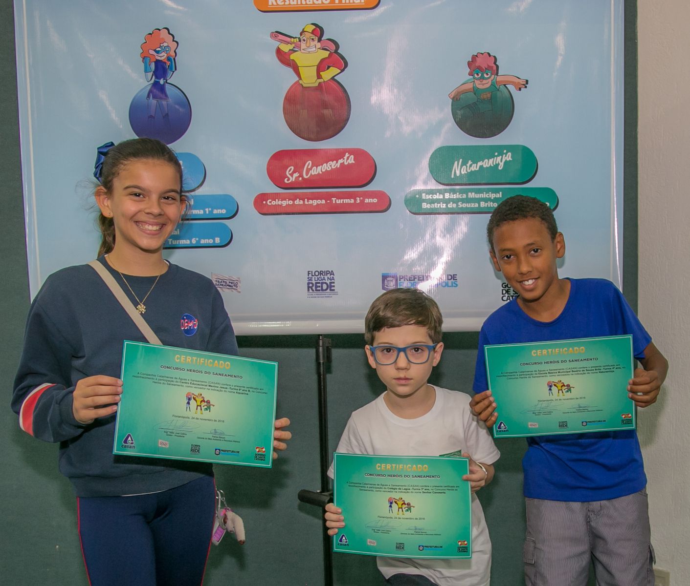 Solenidade realizada na tarde desta quinta-feira (24) no auditório Jacó Anderle no Centro Integrado de Operação e Manutenção da CASAN, no Balneário Estreito, marcou o encerramento do concurso Heróis do Saneamento, realizado pela Empresa para motivar os estudantes a pensarem o tema da água e do saneamento. O evento reuniu professores das escolas e alunos das turmas que tiveram seus nomes escolhidos para batizar os três ‘heróis’: Naturaninja, Senhor Canoserta e Aquarina, que coincidentemente foi proposto por duas escolas.